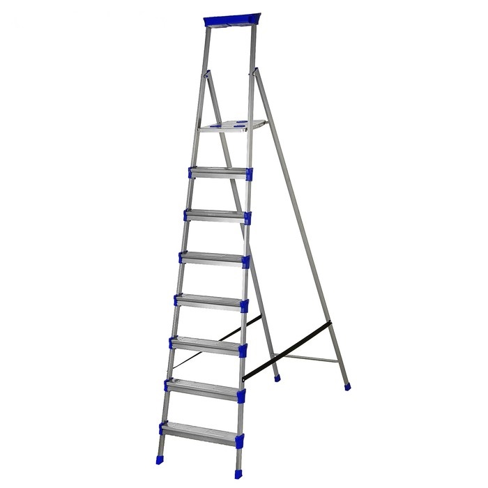 Стремянка металлическая 8 ступеней, высота до рабочей площадки 1730мм, ширина ступени 65мм, многофункциональный лоток для инструментов, страховочная лента, максимальная нагрузка 120кг, вес изделия-11кг. Похожие товары