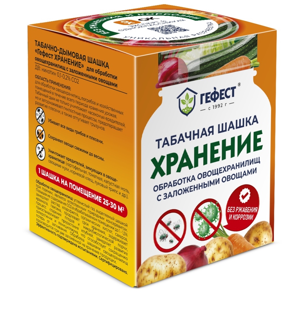 Дымовая табачная шашка «Гефест» ? это эффективное средство для уничтожения насекомых-вредителей в теплицах и парниках, а так же овощехранилищах. Одной из главных особенностей данной шашки является то, что она совершенно безвредна для растений. Напротив, благодаря тому, что при тлении шашки выделяется большое количество CO2, Гефест зачастую используют для стимуляции роста растений. Это позволяет применять шашку в теплицах и парниках в период вегетации, либо в овощехранилищах при заложенной продукции. Табачная шашка «Гефест» универсальна ? она эффективна против большинства видов насекомых-вредителей: В парниках и теплицах: тля медяница листовертка белокрылка паутинный клещ трипсы и пр. В овощехранилищах: картофельная моль томатная моль капустная моль овощные мухи корневой клещ луковый трипс и пр Дымовая табачная шашка «Гефест» эффективно уничтожает насекомых, в то же время, стимулируя рост растений. Если требуется обработать овощехранилище, то шашка не только уничтожает всех насекомых-вредителей, но и улучшает сохранность продуктов (замедляет распад хлорофилла, органических кислот, сахаров и крахмала), продлевая срок хранения. Похожие товары