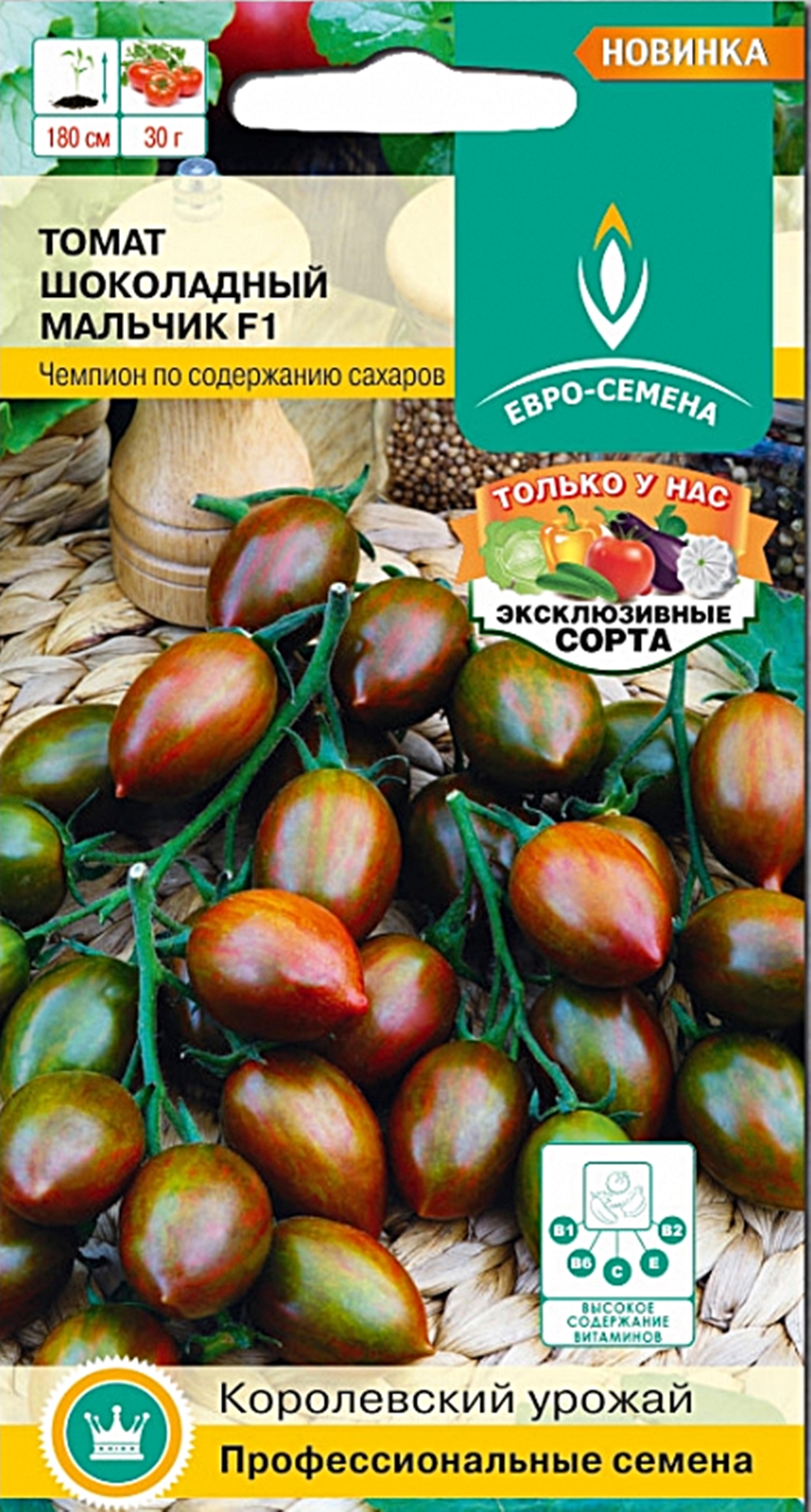 Уникальный раннеспелый гибрид черри томата. Растение индетерминантное, листья среднего размера, темно-зеленые. В кисти до 18 плодов. Плоды очень плотные, сверхсладкие, массой до 30 г, овальные с «носиком», темно-коричневые с темно-зелеными полосами. Гибрид является чемпионом по содержанию сухого вещества и сахаров. Содержание ликопина – высокое. Использование универсальное. Великолепно подходит для сушки и вяленья плодов. Плоды можно собирать как по отдельности, так и целыми кистями. Вкусовые качества отличные. Гибрид высокоустойчив к комплексу болезней, в том числе фитофторозу. Похожие товары