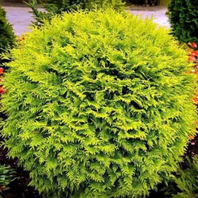 Сорт с шаровидной формой кроны. Хвоя довольно рыхлая, золотистого цвета. Плотность достигается при регулярной стрижке. Кончики побегов, которые получают достаточно солнечного света, имеют желтый цвет, а внутри этого желтого шара хвоя остается зеленой. Осенью туя приобретает медный оттенок, а весной снова становится золотистой. Хорошо растет на влажных и свежих почвах.Предпочитает известковый грунт.Отлично смотрится в одиночных посадках и составных композициях. Можно использовать в невысоких и бордюрных живых изгородях. Отличный вариант при создании контрастного цветового эффекта. Похожие товары