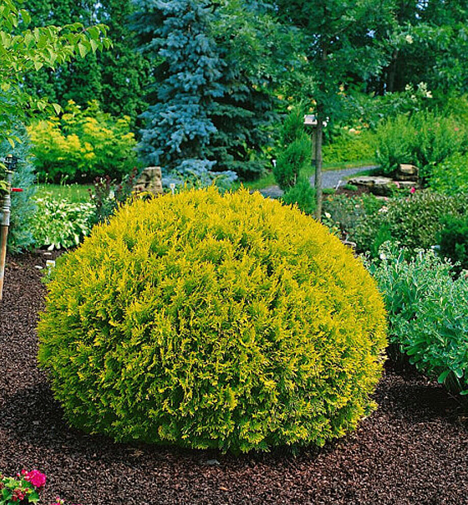 Прекрасный карликовый кустарник, которому найдется место в каждом без исключения саду. Небольшой желтый шарик оживляет ландшафт сада даже в пасмурные осенние дни. Очень декоративный сорт: желтые кончики побегов, которым достается много солнца, полностью покрывают растение, хотя внутри шара листва ярко-зеленая. Осенью хвоя приобретает медный оттенок, но весной снова становится золотистой. Растет медленно 8-10 см в год, максимального диаметра 1-1,2 м достигает лет в 20. Туя западная Golden Globe – всеобщий любимец, очень популярный сорт повсюду, где можно создать нормальные для его выращивания условия. В стрижке не нуждается, но весной может потребоваться санитарная обрезка. Среди непрофессионалов этот сорт зовется «туя желтая шаровидная» или «желтый шар». Похожие товары