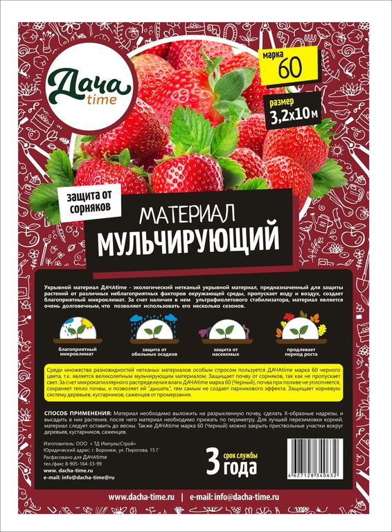 Мульчирующий материал Дача time – экологический нетканый укрывной материал, предназначенный для защиты растений от различных неблагоприятных факторов окружающей среды, пропускает воду и воздух, создаёт благоприятный микроклимат. За счет наличия в нем ультрафиолетового стабилизатора, материал является очень долговечным, что позволяет использовать его несколько сезонов. ПРЕИМУЩЕСТВА Защита от сорняков Защита от пересыхания почвы Защита от насекомых-вредителей Пропускает воздух, воду и водорастворимые удобрения Улучшает зимовку корней растений Среди множества разновидностей нетканых материалов особым спросом пользуется Дача time марка 60 черного цвета, так как является великолепным мульчирующим материалом. Защищает почву от сорняков, так как не пропускает свет. За счет микрокапиллярного распределения влаги почва при поливе не уплотняется. Сохраняет тепло почвы и позволяет ей «дышать». Изолируя плоды и ягоды от почвы, мульчирующий материал препятствует образованию гнилей. Защищает корневую систему деревьев, кустарников, саженцев от промерзания. СПОСОБ ПРИМЕНЕНИЯ Материал необходимо выложить на разрыхлённую почву, сделать Х-образные надрезы, и высадить в них растения, после чего необходимо прижать материал по периметру. Для лучшей перезимовки корней, материал следует оставить до весны. Так же можно закрывать приствольные участки вокруг деревьев, кустарников, саженцев. Срок службы: 3 года. Похожие товары