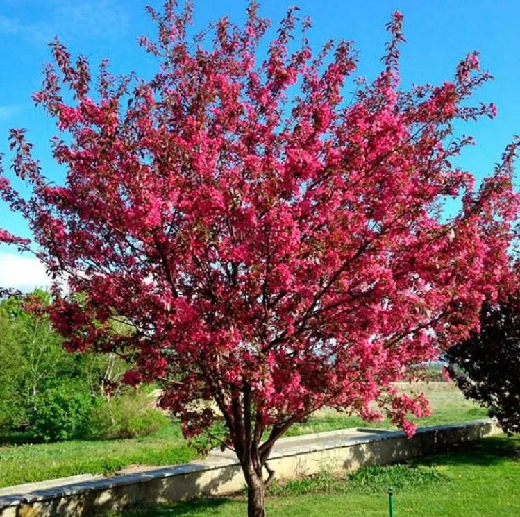 Маленькое медленнорастущее дерево с овальной кроной (высотой около 3 - 4 м в 10-летнем возрасте) с суженными, глянцевыми, темно-фиолетовыми листьями, которые затем немного светлеют, становясь красными осенью. В течение мая (с начала до середины) яблоня обильно цветет: крупные темно-карминные или рубиново-красные бутоны становятся рубиново-красными или малиново-красными цветами с приятным ароматом. Плоды созревают к середине сентября. Местоположение: солнце. Почва: предпочитает плодородную, умеренно влажную почву. Использование: одиночные и групповые посадки. Похожие товары