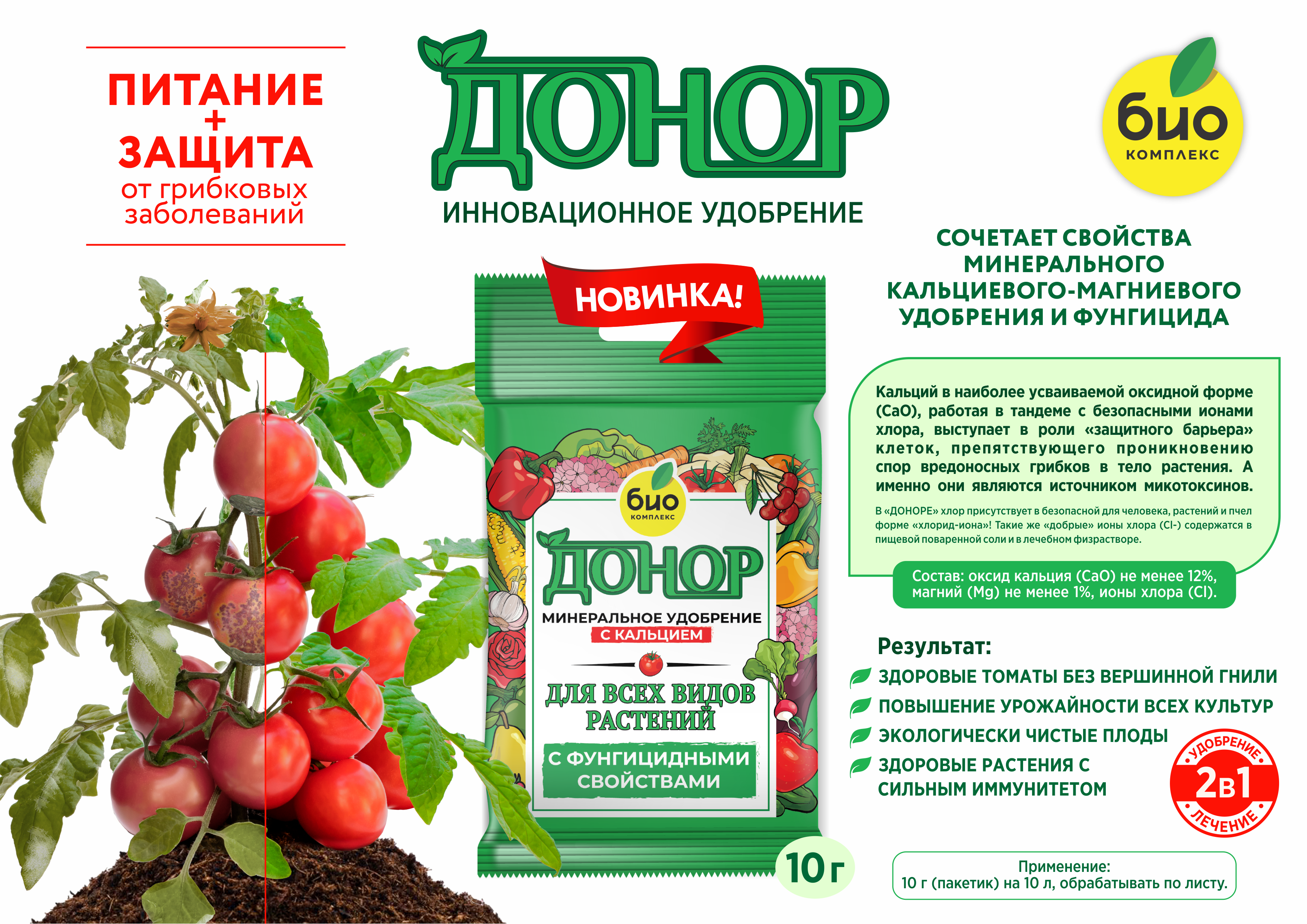 «ДОНОР» сочетает свойства минерального кальциевого-магниевого удобрения и фунгицида (защита от грибковых заболеваний).