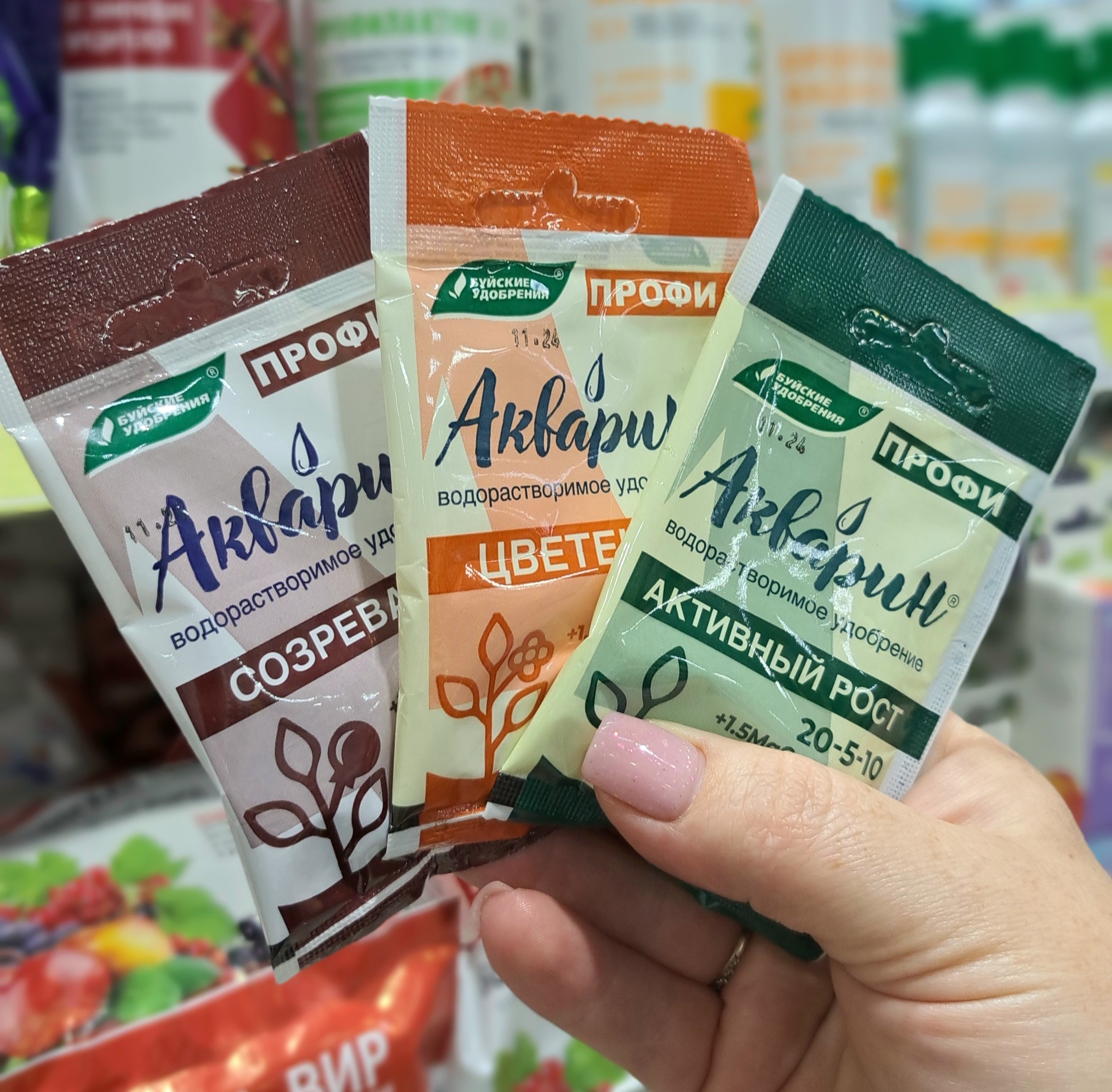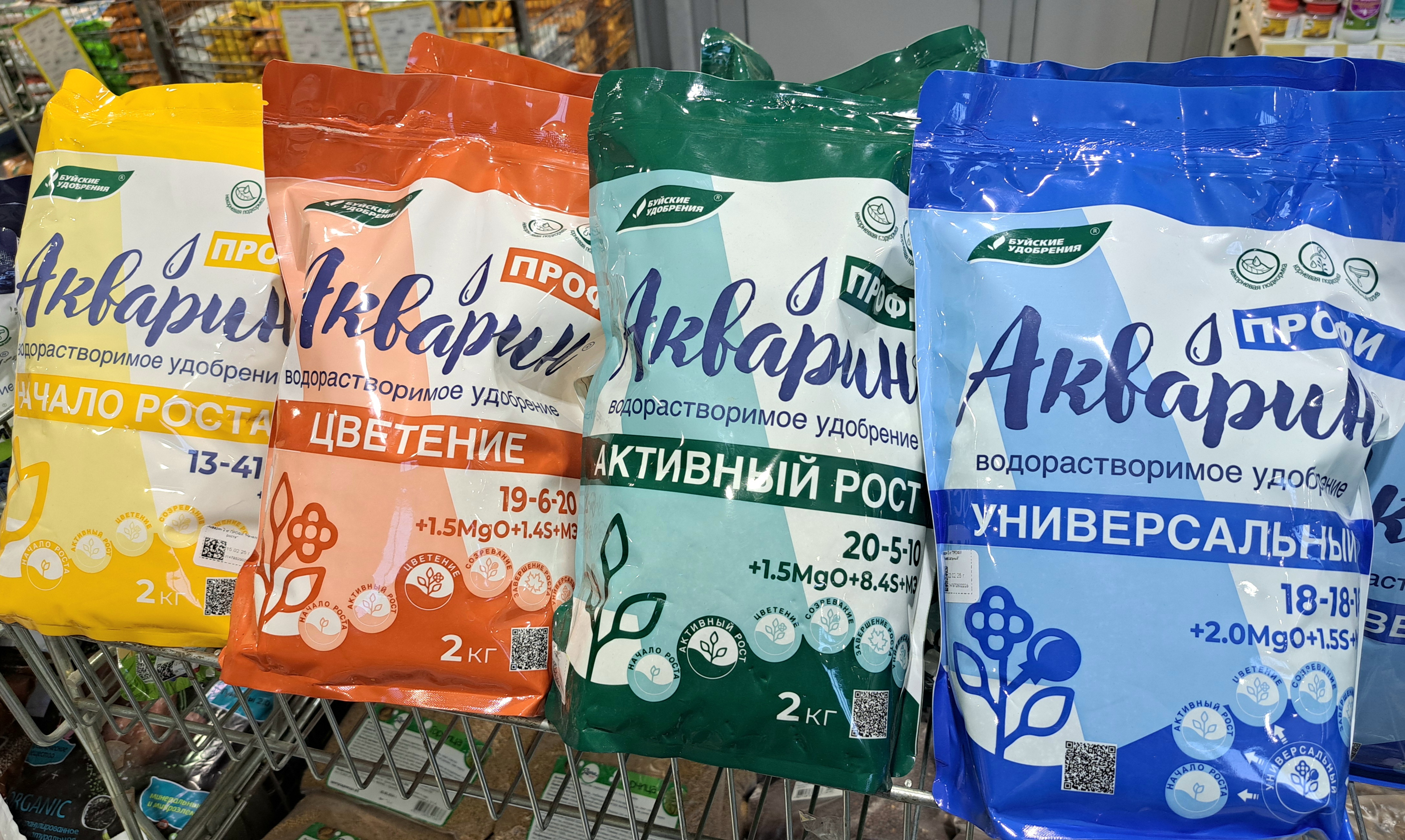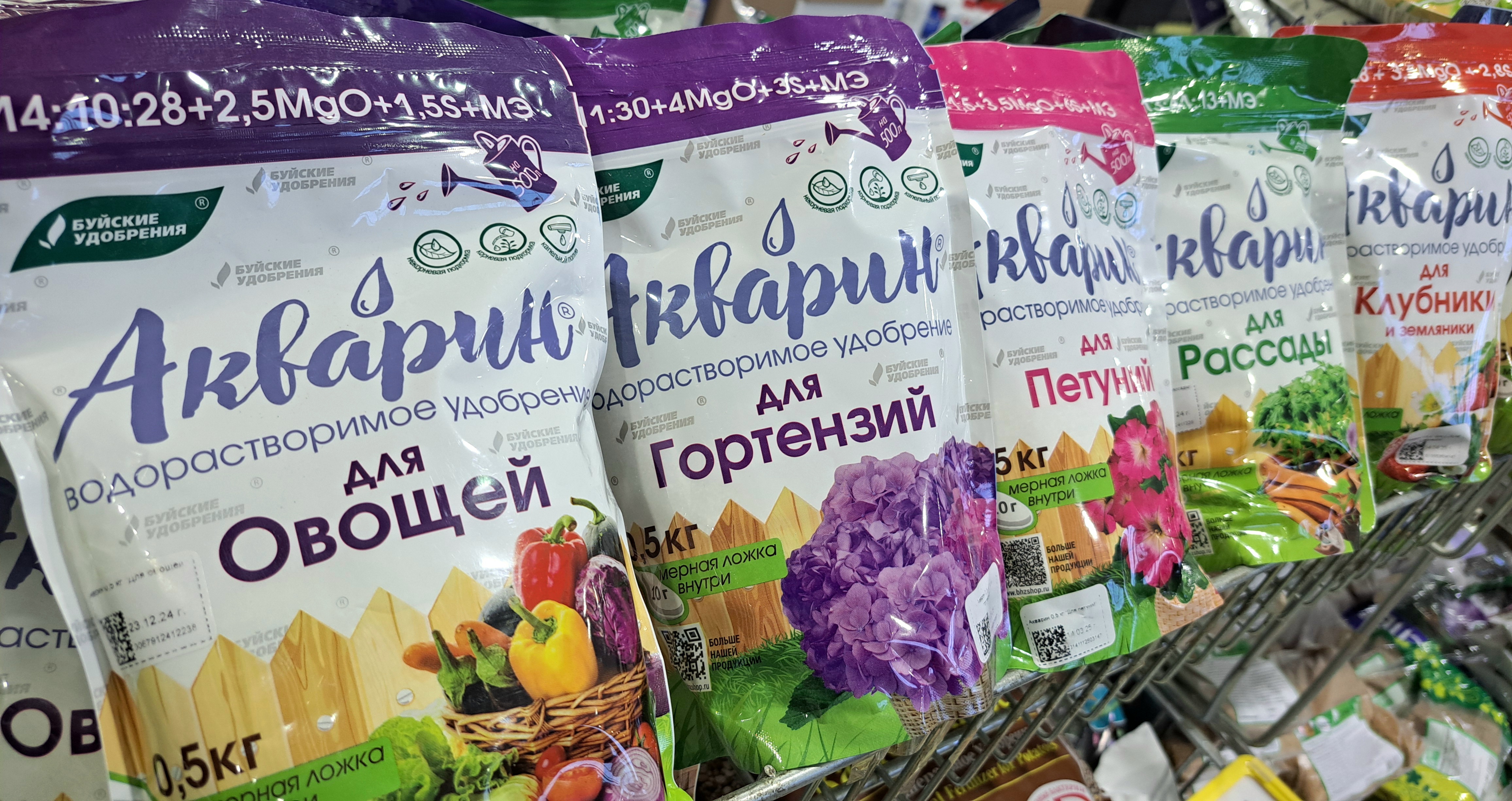 «Акварин», содержащий сбалансированный набор макро- и микроэлементов для полноценного развития растений, представлен у нас для широкого спектра культур: для овощей, для рассады, для цветов, для газонов, для ягодных, для хвойных, для активного роста и цветения, а также универсальный. В наличии разные объёмы «Акварина»: пак. 20г, 100г, 0,5кг и 2кг.