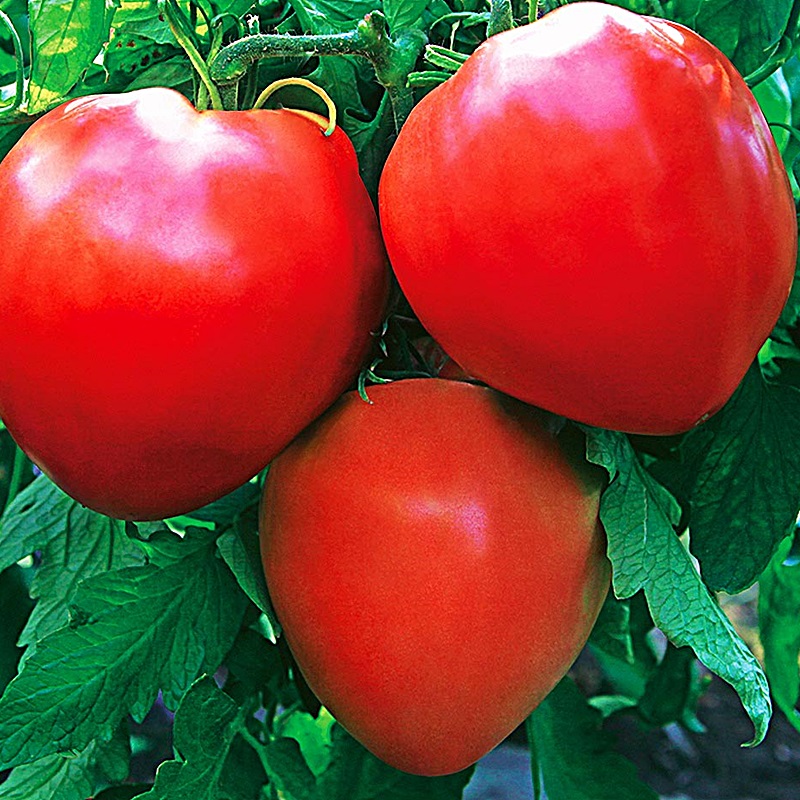По форме помидоры сердцевидные, ярко-красные. У гибридов окраска видоизменяются от лимонной и малиновой до густо-коричневой и черной. Средняя масса – от 300-500 г до 1 кг. На кусте крупные экземпляры располагаются ближе к земле, более мелкие – в верхней части стебля. У данного сорта гигантские размеры плодов, плотная мякоть и неповторимый сладкий вкус.