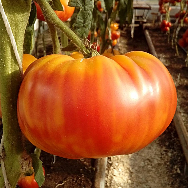 Сорт устойчив к фитофторозу и альтернариозу. Он среднего срока созревания, плодоношение начинается через 110-115 дней. Плоды округлой формы, слегка приплюснутые, ребристые у плодоножки. Размер нижних кистей крупнее (могут достигать массы 400 г), размер верхних – поменьше, обычно не больше 150 г. Урожайность – 6,2-8,2 кг/кв.м, при хорошем уходе в теплице может достигать 12 кг/кв.м. Плодоношение длится до осени.