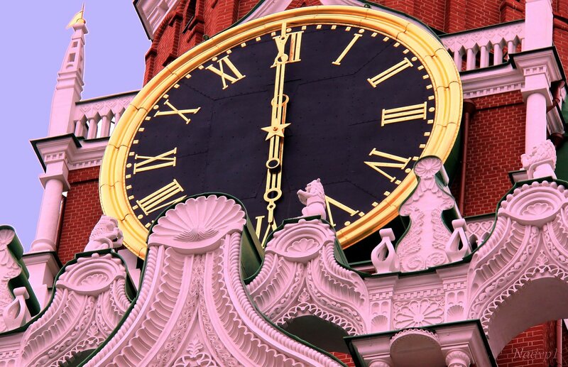 10. Куранты расположены в Спасской башне Кремля. На ней есть четыре огромных циферблата с золочёными цифрами, которые смотрят на четыре стороны света. Стрелки приводит в движение механизм, скрытый за стенами башни. Он занимает три этажа. Раньше куранты заводили вручную, а сейчас это делают при помощи электричества.