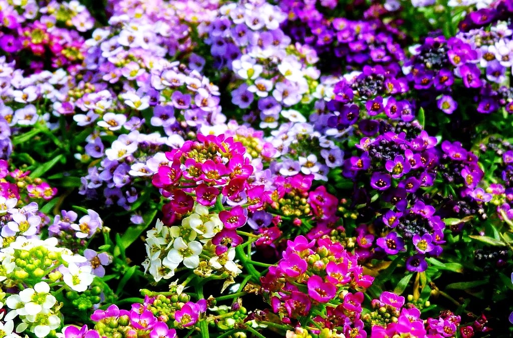 Начнем наш список с Алиссума. Неприхотливое во всех отношениях растение. Требует не закармливания и солнечного места. Сладкий, медовый аромат Алиссума озарит весь Ваш сад и двор, распространяясь на огромные пространства. Из разных ярких окрасок цветка можно создать яркое пятно, делая микс из цветочков. Лишь из одного растения вырастает прекрасная кучка цветочков.