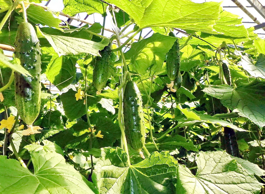 Ещё пару слов об уходе. Мы больше любим подвязанные огурцы. Они меньше болеют и так как мы сажаем само - плодные огурцы, у которых плодоношение на центральном стебле, его удобно подвязывать с точки зрения обеспечения огурца углекислым газом. Если у вас куча места для боковых побегов, для пчело - опыляемых сортов, то приготовьтесь к следующей картине. У пчело - опыляемых сортов огурцы появляется чуть-чуть позже, чем у само – плодных. Так вот, огурцы начинаются чуть позже в расти, но их очень много. Там может получится и по 5-6 ведер в день на один огород! И так продолжается неделю-полторы, по сути до первого дожд,я потому что после дождя начинает развиваться грибковое заболевание. Вы замечали, это если на листьях есть пятна, либо краешек начинает желтеть и как бы усыхать, это действительно заболевание с которым нужно бороться противогрибковыми средствами. Но вы толком побороться не можете, потому что земля к листу очень близко, идет дождь и лист постоянно заражается, и плюс выпадает роса утром и вечером. То есть огурцы находятся в очень большом таком риске заболевания, и это заболевание в какой-то момент наступает. А когда огурцы подвязаны их конечно профилактически тоже нужно обрабатывать, но они намного меньше болеют, то есть вот из-за дождя там пару нижних листиков могут пожелтеть, но дальше вот до самых морозов верхушка будет зеленая. Все будет отлично, даже если вы уедите на недельку две и потом вернетесь, то уидите, что огурчики наши приболели, мы берем и обрабатываемых биопрепаратами фитодоктор и триходермин. Чередуем их. Но соответственно нижние листики конечно назад никогда не позеленеет, если они уже пожелтели. Пораженная ткань и она назад зеленой не будет, но зато, сверху нарастает молодая листва, молодые огурчики, все дальше продолжается плодоношение на отлично.