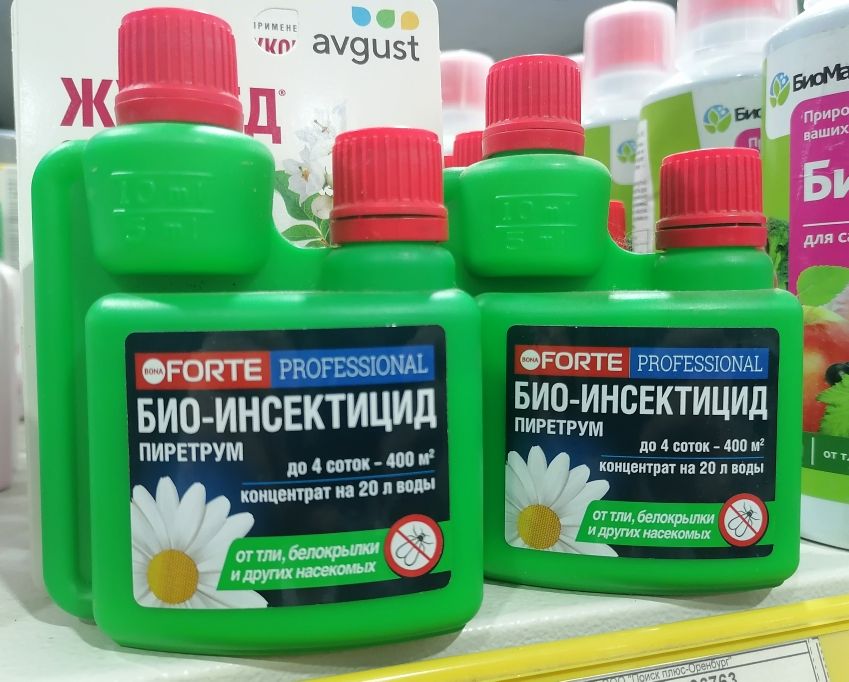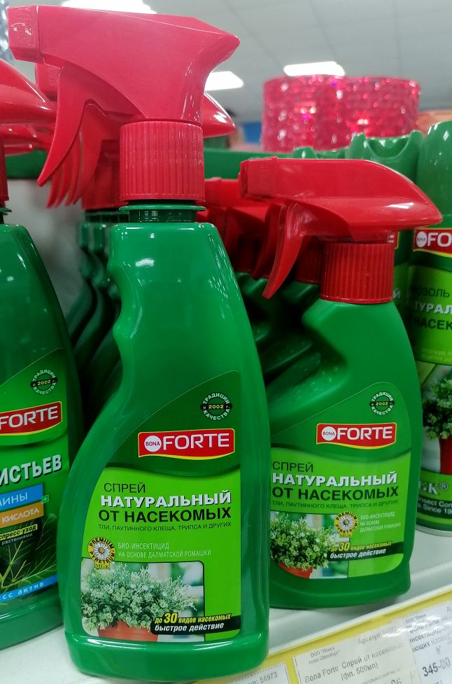 Ещё большие ограничения по инсектицидам существуют в домашнем растениеводстве. Ведь в жилье мы не можем применять многие средства, допустимые для открытых участков, так как они могут быть опасны для людей или домашних питомцев. И здесь тоже выручит пиретрум – спрей Бона Форте от летающих и ползающих насекомых. Удобный и эргономичный флакон в 500 мл – это идеальный вариант для обработки комнатных растений. Распылитель этого средства даёт широкое и равномерное облако мелкодисперсной взвеси, похожей на туман. Такая струя помогает качественно обработать растения с различной высотой и густотой кроны. Ну, а сам пиретрум смертоносен для всех видов вредителей, встречающихся в домашних условиях. В наличии есть также Bona Forte Аэрозоль от летающих насекомых-вредителей, 300мл и Bona Forte Натуральное инсектицидное средство от летающих насекомых-вредителей, флакон 250мл.