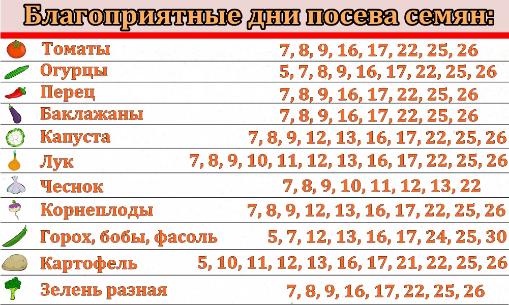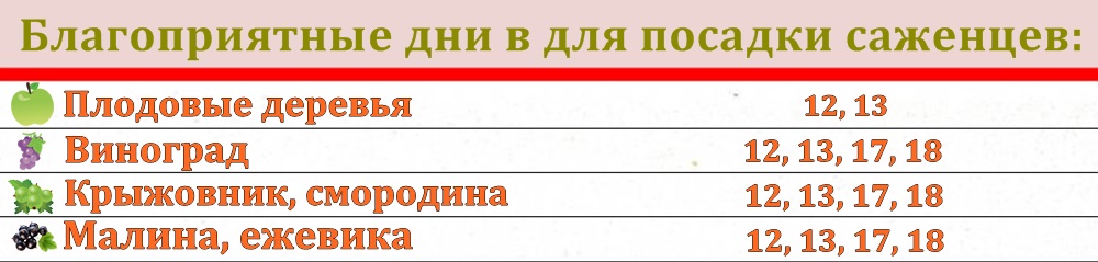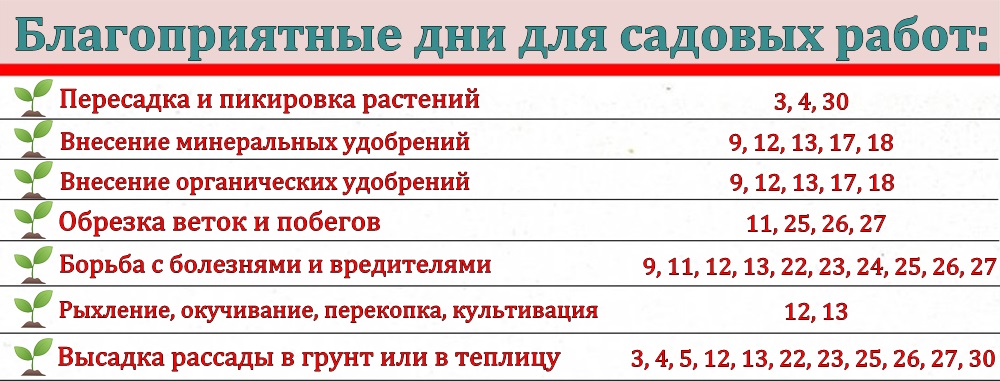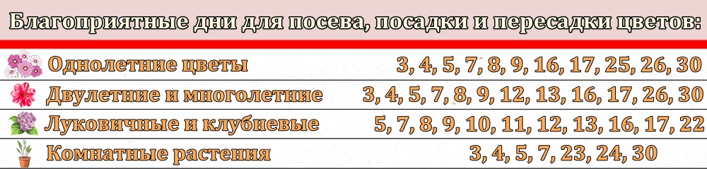 Благоприятные дни посева семян, благоприятные дни посева и посадки цветов, благоприятные дни посадки саженцев, а также благоприятные дня садовых работ приведены ниже в таблицах.