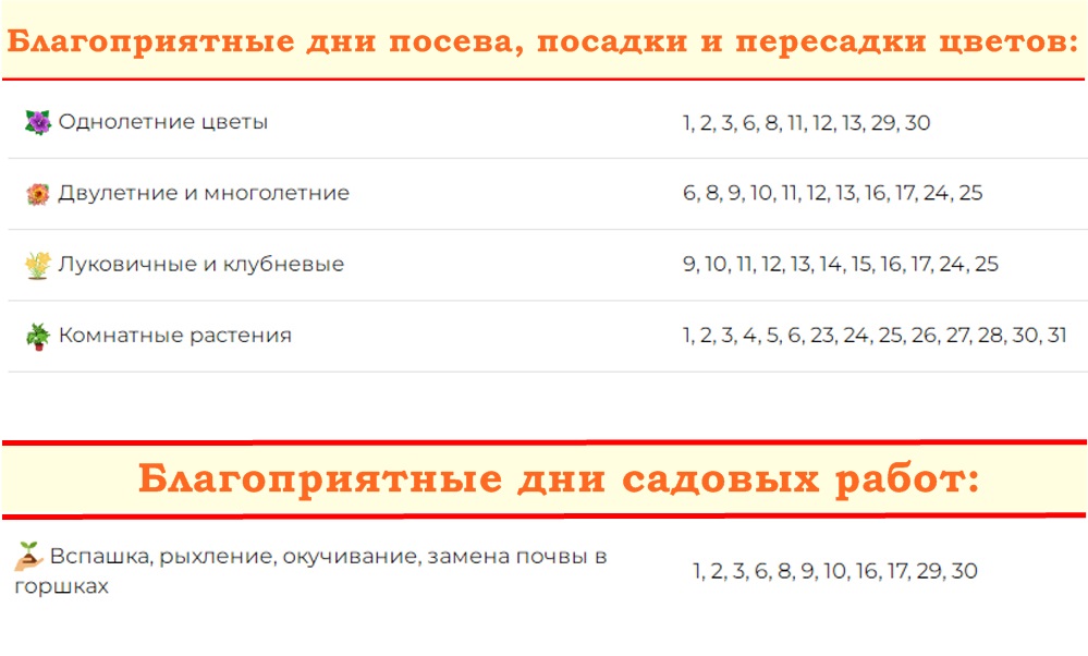 Благоприятные дни посева семян, благоприятные дни посева и посадки цветов, а также благоприятные дня садовых работ приведены ниже в таблицах.