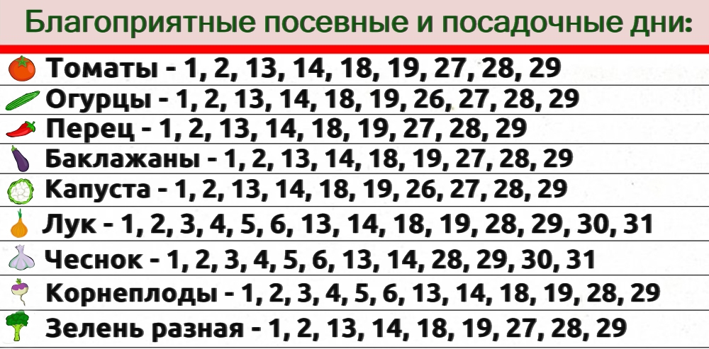 Благоприятные дни у огородников, чтобы проводить посев на рассаду белокочанной и цветной капусты, брокколи, лука-порея, сельдерея корневого. Возможна пикировка сеянцев томатов, перцев, баклажанов. Проводится выгонка зелени петрушки, щавеля, сельдерея, свеклы, мангольда.