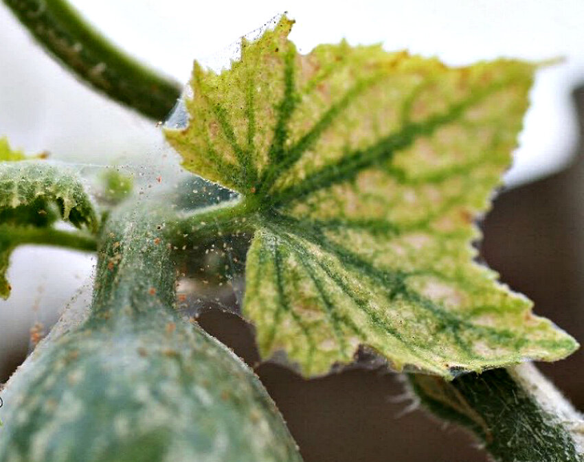 Паутинный клещ – мелкое паукообразное, чье присутствие на растениях выдает тончайшая белая паутина (на начальной стадии заражения обычно на нижней стороне листьев, после – переходящая на стебли и плоды). Увы, плетением паутины действия клеща не ограничиваются – вредитель и на стадии личинки, и на стадии имаго высасывает сок из растений, из-за чего листья сперва покрываются светлыми пятнышками, а затем полностью желтеют, засыхают и опадают. Паутинный клещ предпочитает сухой воздух при высокой температуре, поэтому чаще всего вредит огуречным растениям при недостаточных поливах засушливым летом или при редких проветриваниях в теплице. Размножается это паукообразное очень быстро, поэтому при бездействии огородника способно быстро заразить все растения, находящиеся рядом.