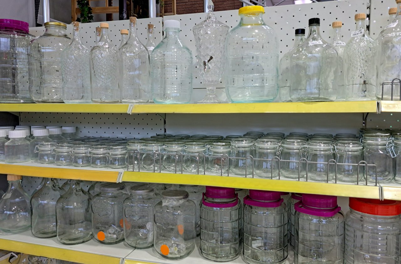 Банки и бутылки стеклянные разных объёмов;