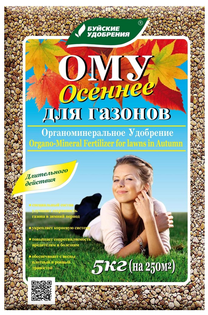 Органо-минеральное удобрение (ОМУ ) для Газонов Осеннее (Буйские удобрения) предназначено для основной заправки почвы при закладке газонов, спортивных и декоративных травяных полей, кортов, а также для их подкормок в течение вегетации. Способствует сбалансированному питанию макро- и микроэлементами, увеличению прочности травостоя, улучшению агрофизических свойств почвы, её структуры, воздухо и водопроницаемости.