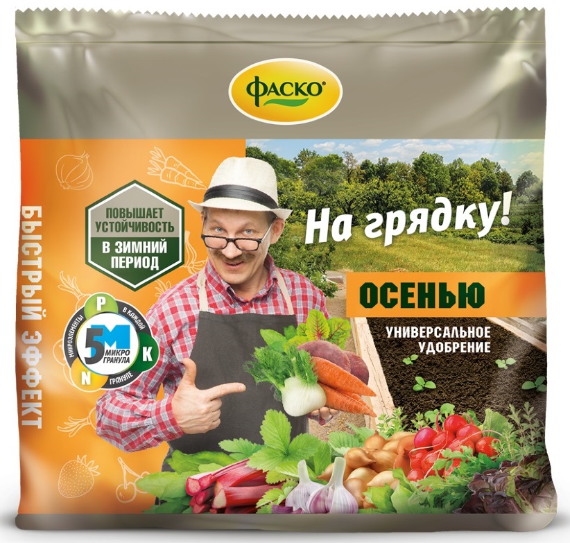Универсальное удобрение «На одну грядку» Осень (Фаско) предназначено для выращивания таких культур как земляника, озимый чеснок, лук-севок, редис, морковь, пастернак, свекла, зеленные, ревень, щавель, фенхель, а также пряные травы. Используется в качестве основного удобрения и раскислителя почвы, в период с августа по октябрь, а также для подкормок с целью повышения зимостойкости, улучшения корневой системы, роста и развития растений.