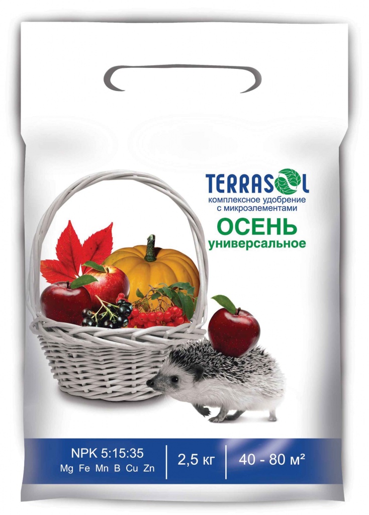 Комплексное минеральное удобрение Террасол Осень идеально подходит для плодово-ягодных, луковичных и цветочно-декоративных культур. Применяется осенью в качестве основного при осенней подготовке почвы, для местного внесения в лунки при посадке и для подкормок. Подобранная пропорция элементов питания гарантирует хорошую приживаемость растений при осенней посадке, восполнение недостатка элементов питания, лучшее вызревание побегов и перезимовку деревьев и кустарников.