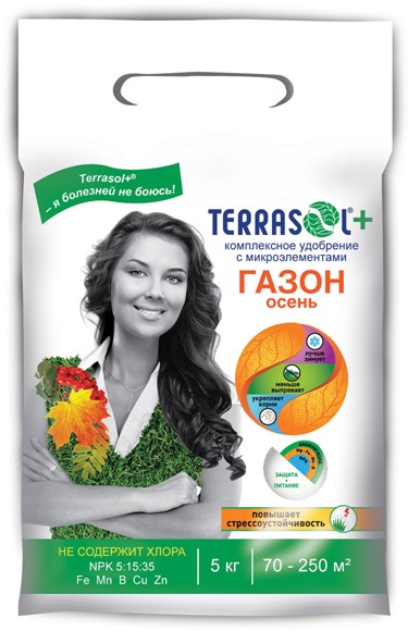 Удобрение Террасол Газон Осень применяется при закладке газонов в августе-сентябре и для осенних подкормок вегетирующих газонов. Комплексное минеральное удобрение (тукосмесь) с микроэлементами для осенней закладки и подкормки всех видов газонов (универсальный, спортивный, теневыносливый, парковый, цветущий, партерный и другие).