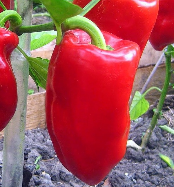Для открытого грунта и плёночных теплиц. Среднеранний (120-130 дней) сорт. Растение полураскидистое, низкорослое, высотой 35-45 см. Плоды пониклые, конусовидные, длиной 9-10 см, массой 90-120 г, толщина стенок 4-5 мм. В биологической спелости темно-красного цвета. Сорт устойчив к болезням.