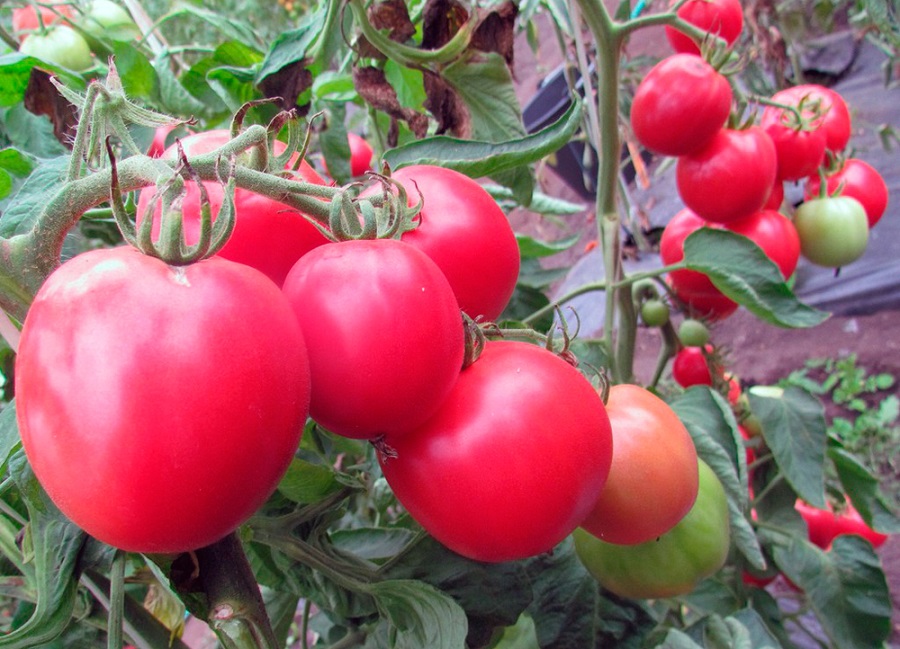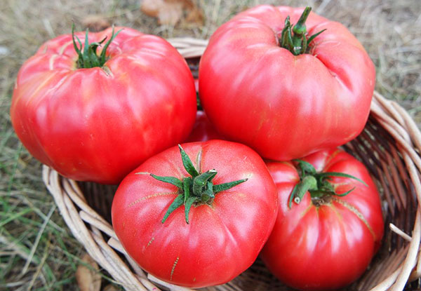 Для открытого грунта и теплиц. Крупноплодный урожайный сорт с насыщенным темно-розовым цветом плодов. Куст детерминантный, высотой до 80-90 см, средней ветвистости. Крупные (массой 350-450 г) плоско-округлые, с легкой ребристостью.