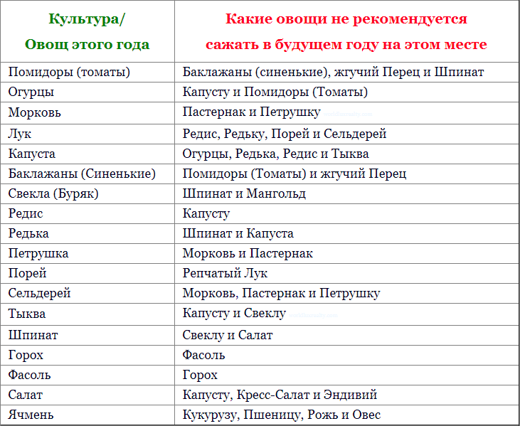 Сейчас мы расскажем какие культуры прижывутся наверняка, на месте старого отцветшего растения, а какие взойдут очень слабовероятно. Дело в том, что увядшие останки былого урожая могут помешать урожайности в новом году, поэтому необходимо следовать инструкцие, приведенной в таблице ниже. То есть, совет о том, что сажать на том месте, где в прошлом году у вас росли какие-то другие овощи.