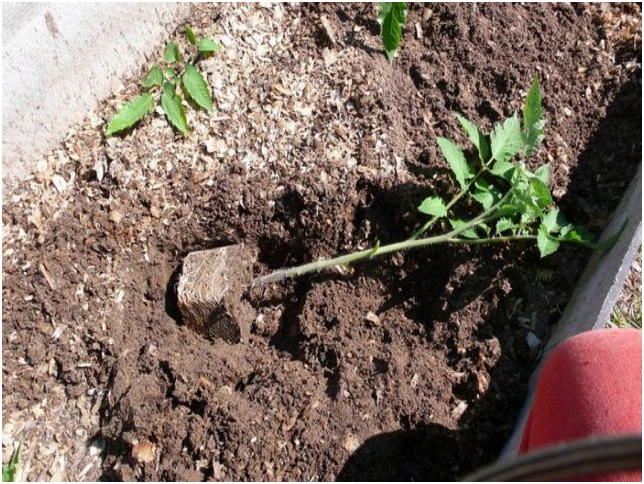 Первый шаг при таком виде посадки – очистка стебля сеянца от листьев на 2/3 длины. Сделать это надо заранее, чтобы ранки успели подсохнуть, и в них не попала инфекция. Затем выкопайте бороздку длиной в 10 см, уложите в нее растение корнями на юг и засыпьте землей, оставляя открытой только самую верхушку сеянца. Заключительный этап – обильный полив высаженных растений.