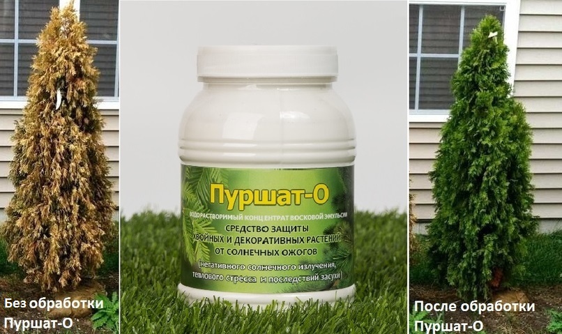 Чтобы защитить хвойные и декоративные растения от солнечных ожогов, деревья можно укрыть мешковиной или затеняющей сеткой. Но есть более легкий и удобный способ защитить хвою от солнечных ожогов – профессиональное и солнцезащитное средство «Пуршат-О».