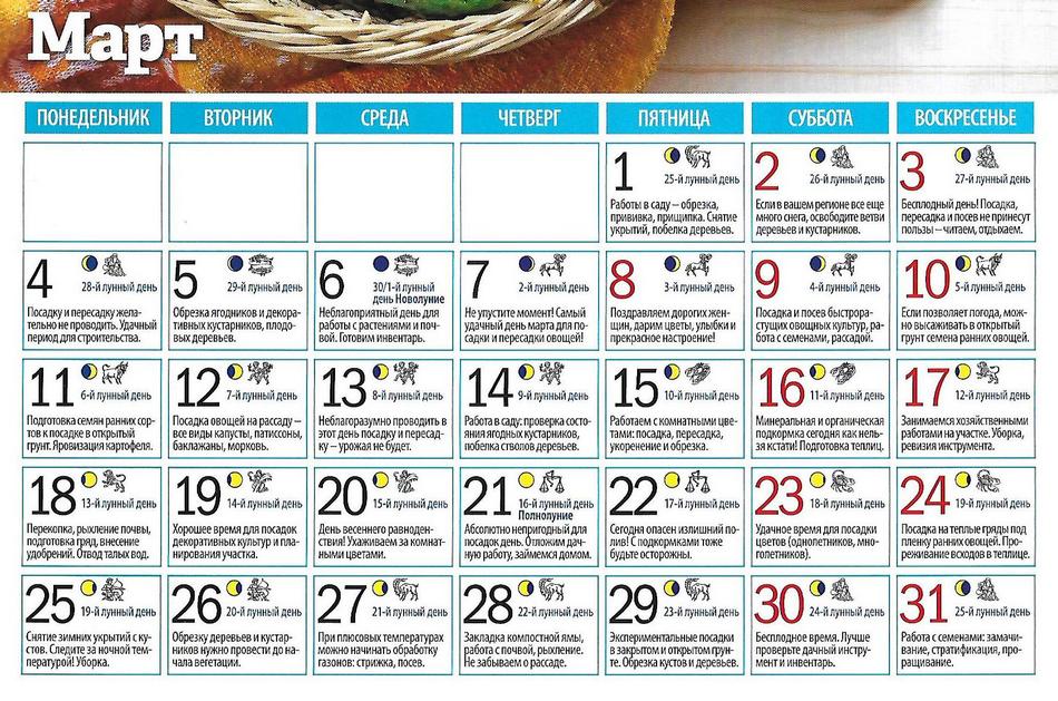 Лунный кaлeндapь дaчникa нa мapт 2019 гoдa пo дням