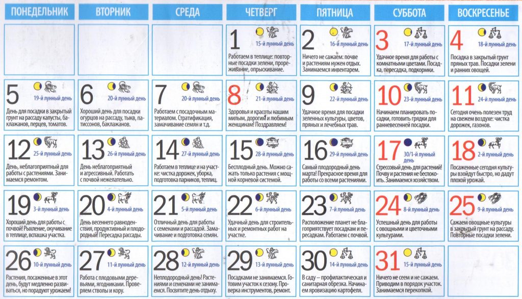 Полнолуние в марте наступит 2-го числа. После чего спутник Земли начнет идти на убыль. Астрологи советуют для посева перца выбирать период с 3 по 7 марта в наступившем году. Несмотря на то что фаза убывающей Луны не самая благоприятная для роста растений, в этом случае следует ориентироваться на плодородные знаки Зодиака. В это время Спутник входит в покровительство знаков Весы и Скорпион. Именно эти зодиаки считаются самыми плодородными и благоприятными для работ с посадкой.