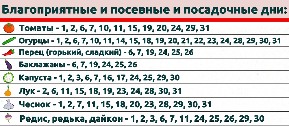 Огородники сеют редис, салат, лук, чеснок, петрушку, корнеплоды на зелень. Высеиваются огурцы на рассаду для того, чтобы выращивать в домашних и тепличных условиях. Сеют японскую, китайскую, листовую пекинскую капусту. Отличные дни для перекопки и рыхления земли, а также внесения питательных смесей и увлажнения грунта.