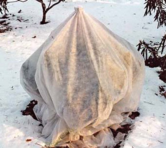 Конечно, лучшая защита растений зимой — толстый слой снега. Камелию можно утеплить, надев на нее «пальто» из мешковины или агроспана, а декоративные кустарники, чувствительные к холодам, успешно перезимуют, если обернуть их агроспаном. Несколько колышков  изнутри поддержат конструкцию, чтобы не упала.
