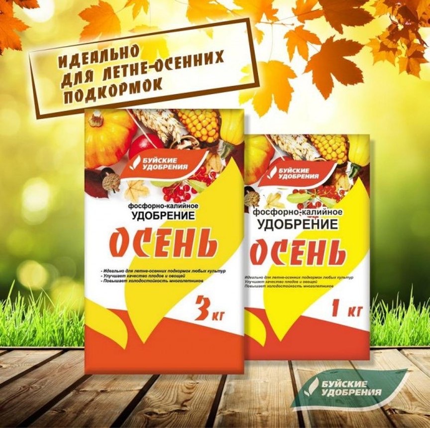 Минеральное удобрение «Осень» от Буйского химического завода совсем не содержит азот, немного фосфора (5%) и значительная часть калия (18%). Удобрение предназначено для внесения в сухом виде с последующей заделкой в почву и последующим поливом. Кроме макроэлементов, в удобрении содержится: