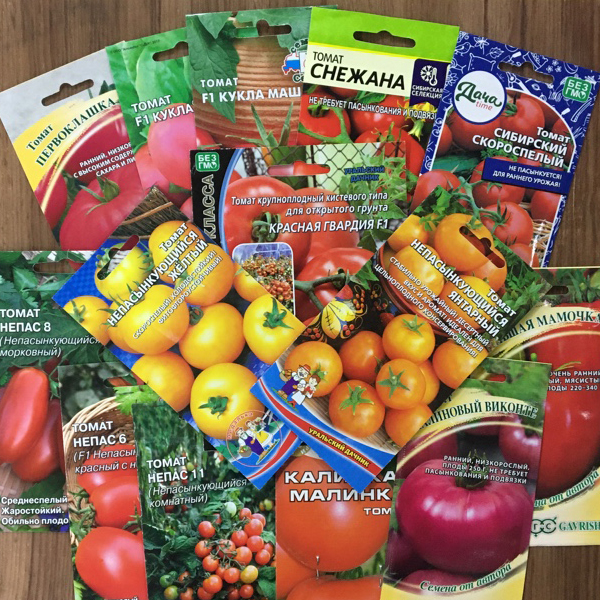 Особое внимание предлагаем обратить на группу непасынкующихся томатов, которые можно выращивать без рассадным способом - в открытом грунте, даже в северных широтах. Эти вкусные и урожайные сорта отличаются большим разнообразием цвета, формы и размеров (Непасынкующийся Желтый, Большая Мамочка, Первоклашка, Малиновый Виконте, Калинка-Малинка, Красная Гвардия, Красный Петух, Кукла, Кукла Маша, Непас 6, 8 и 11, Сибирский Скороспелый, Снежана). Они позволяют получить максимальный урожай при минимальном уходе.
